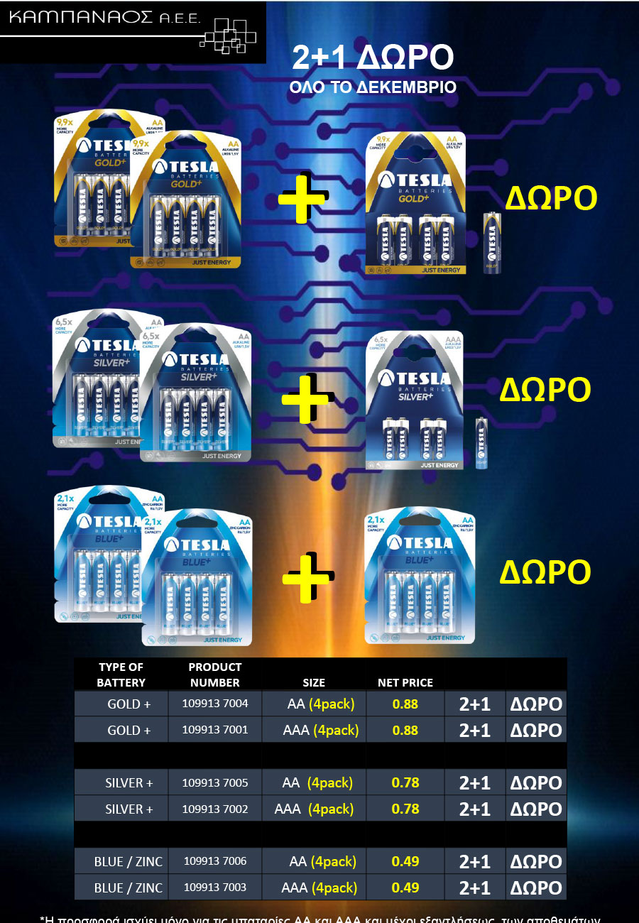 Προσφορά της εταιρείας Καμπανάος Α.Ε.Ε. στις μπαταρίες TESLA τύπου ΑΑ και ΑΑΑ .